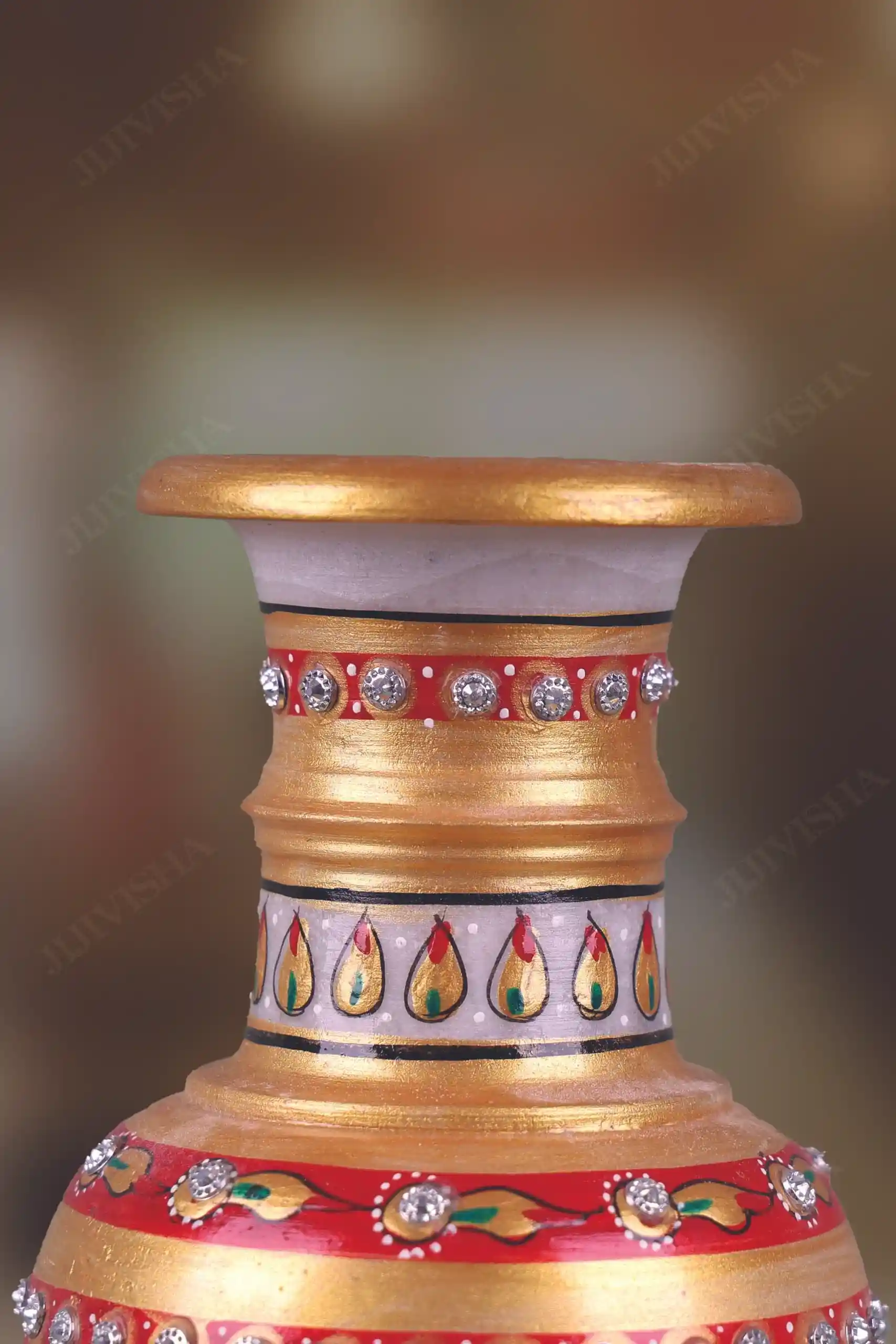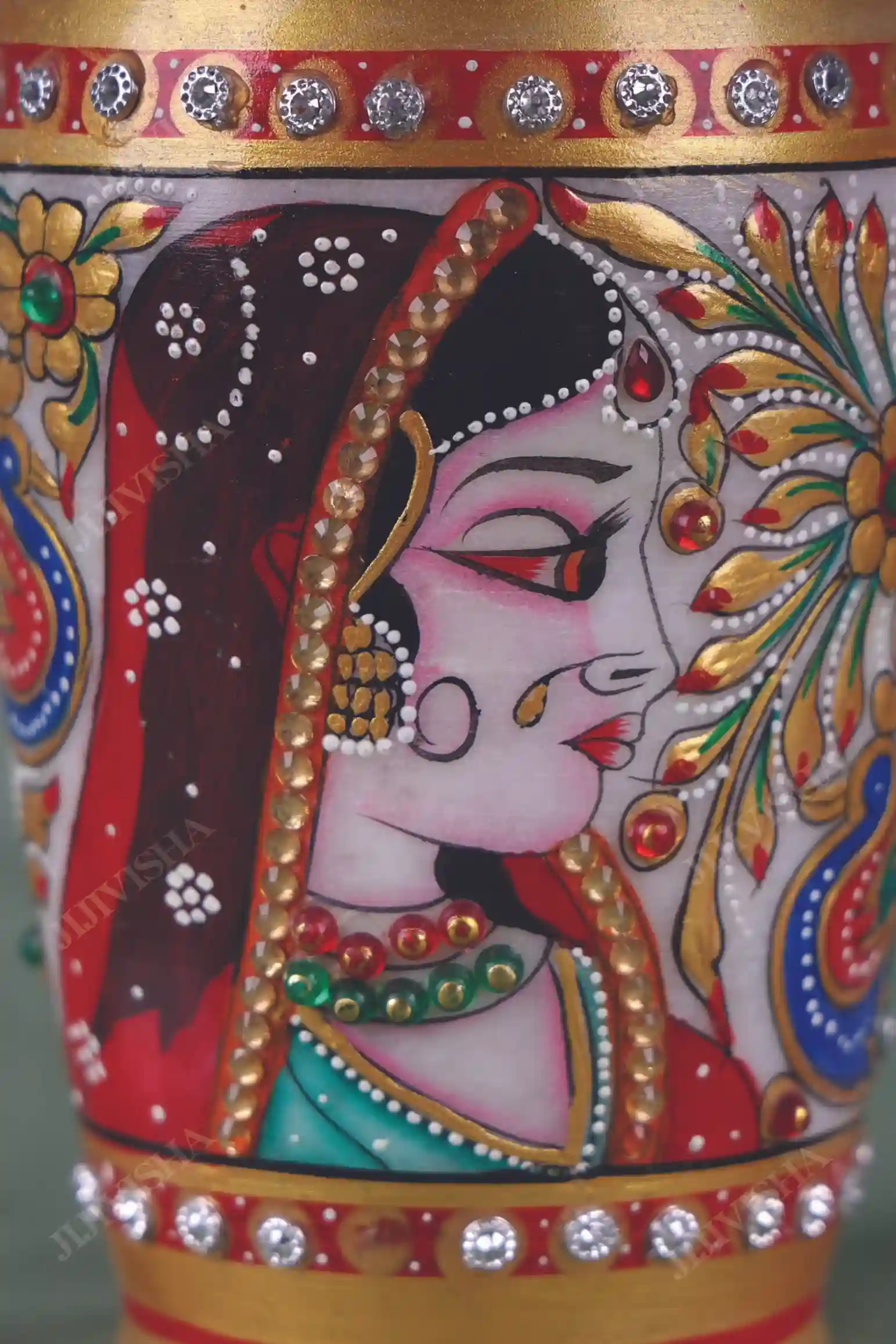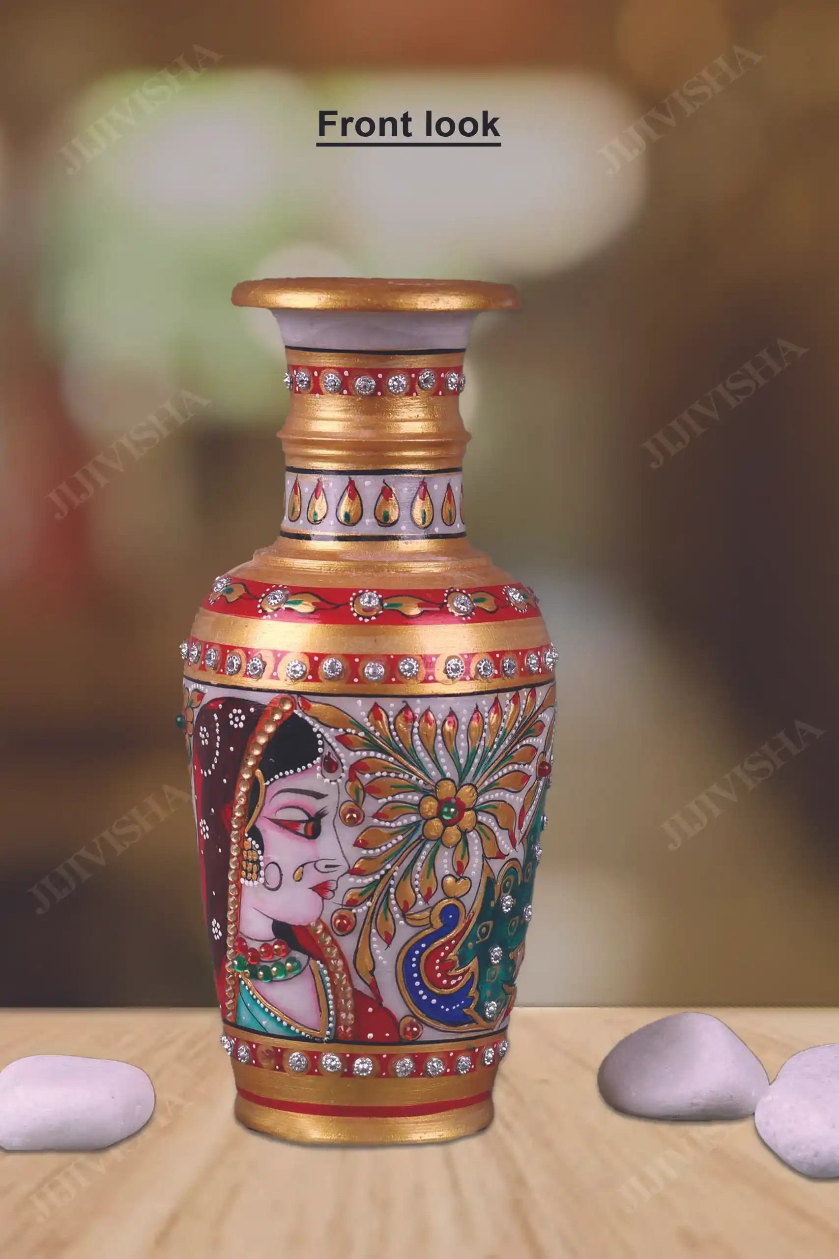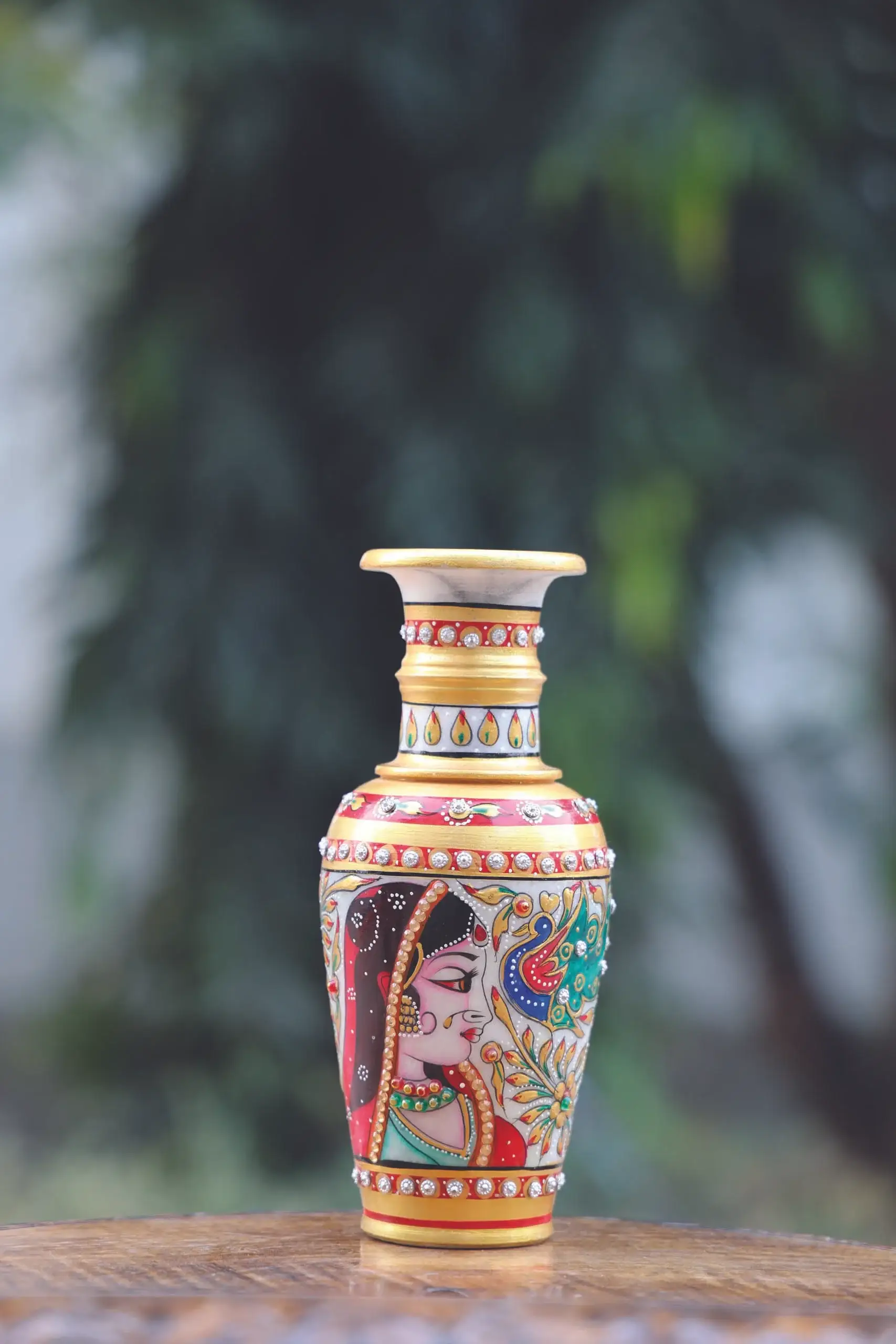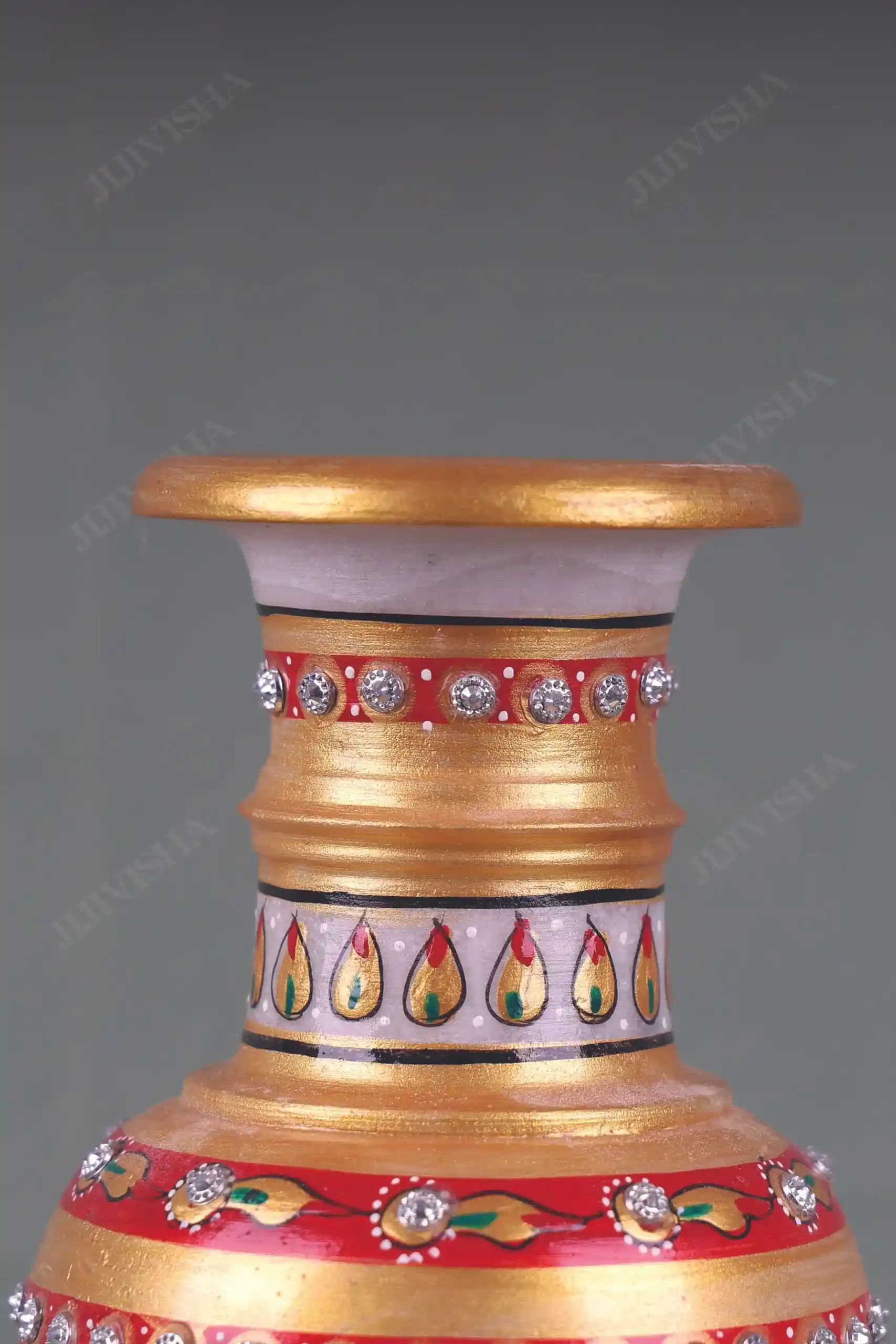 - This vase features a stunning floral design, with intricate detailing in shades of red, green, and gold, creating a beautiful and eye-catching display. The vase is carefully crafted to be both sturdy and elegant, making it a perfect addition to any home decor. Whether displayed on its own or filled with flowers, this Marble Vase with Meenakari Work is sure to add a touch of beauty and sophistication to any room.