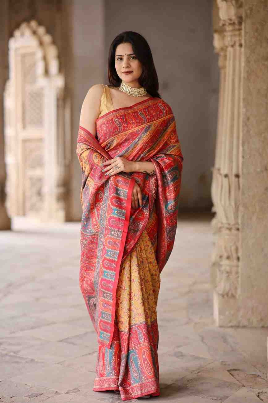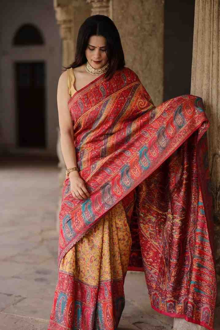 - Silk and mulmul mixed handwoven Kanhi saree is a luxury to own. It has got golden zari motifs woven across the saree. It comes with two blouse pieces.