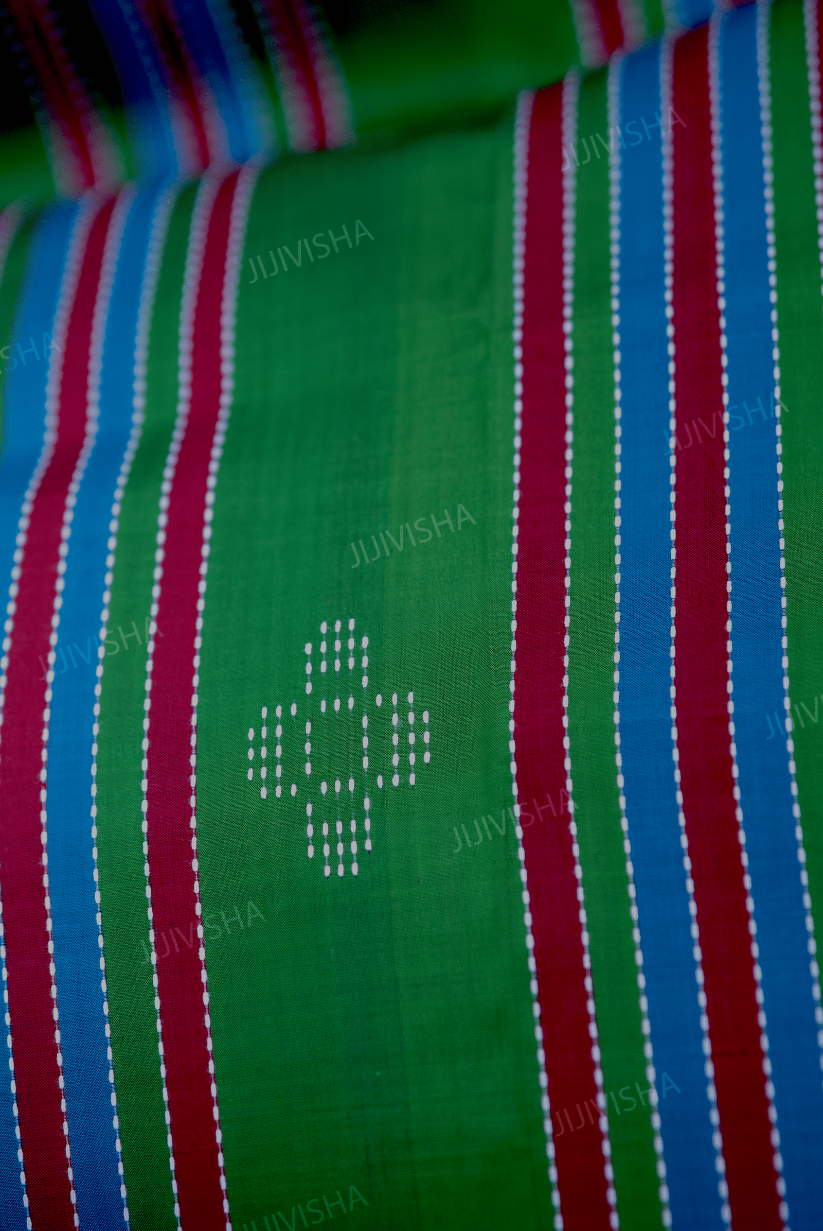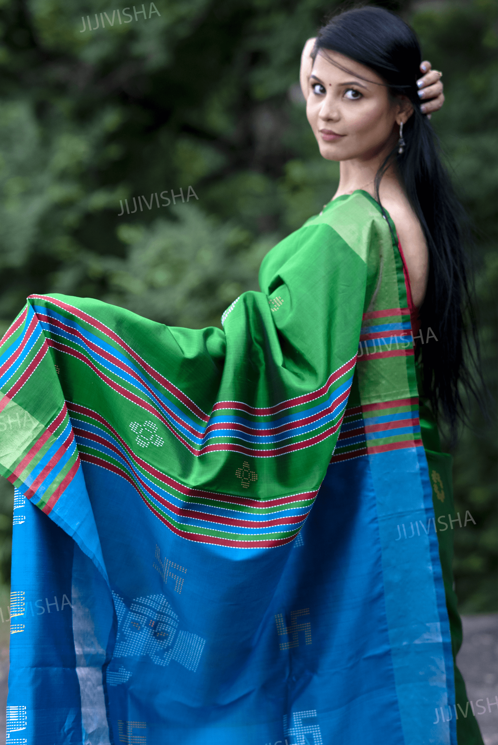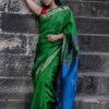 Be the first to review “Regal Verdure: Leaf Green and Royal Blue Bishnupuri Pure Silk Kalakhetra Handspun Handwoven Saree”