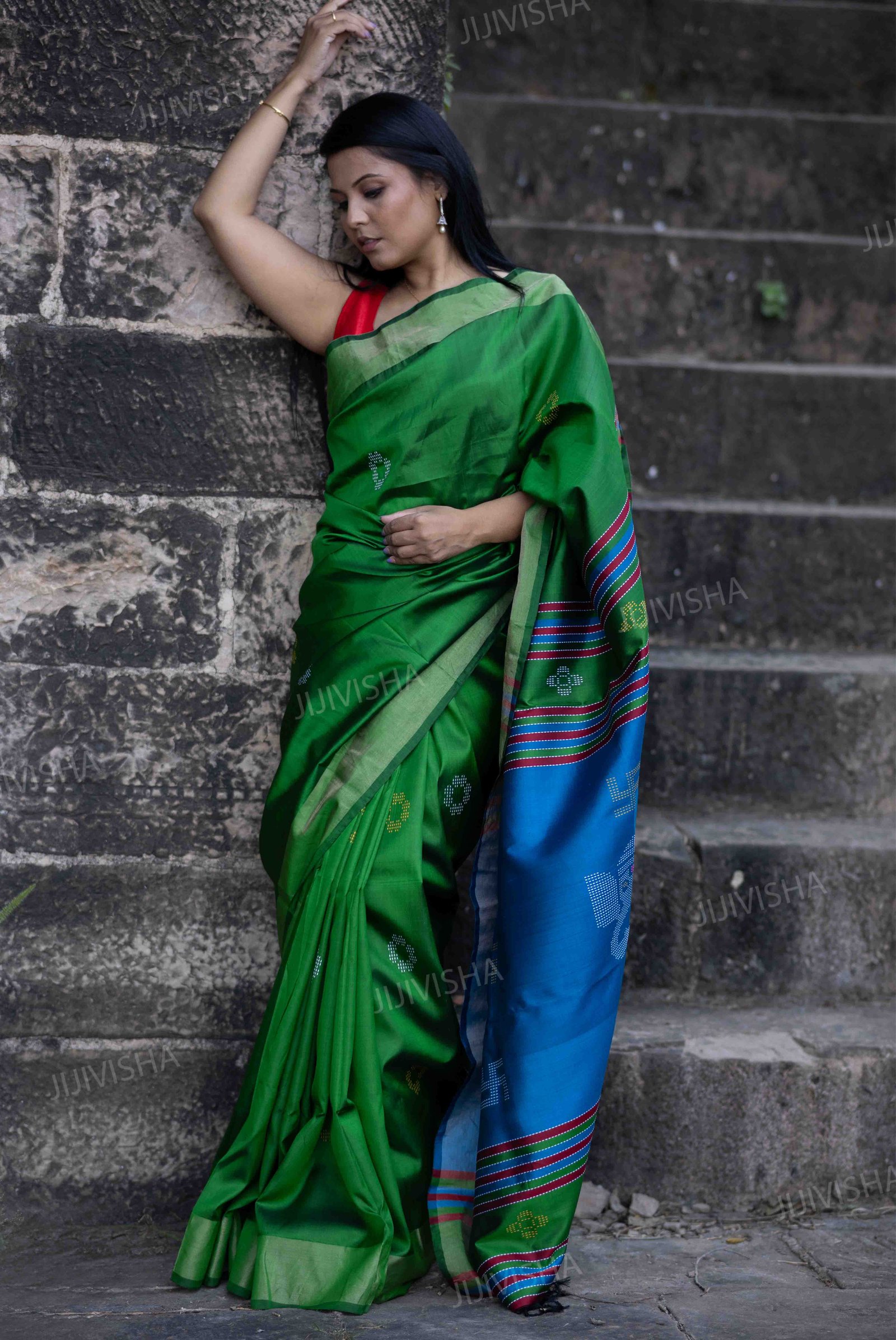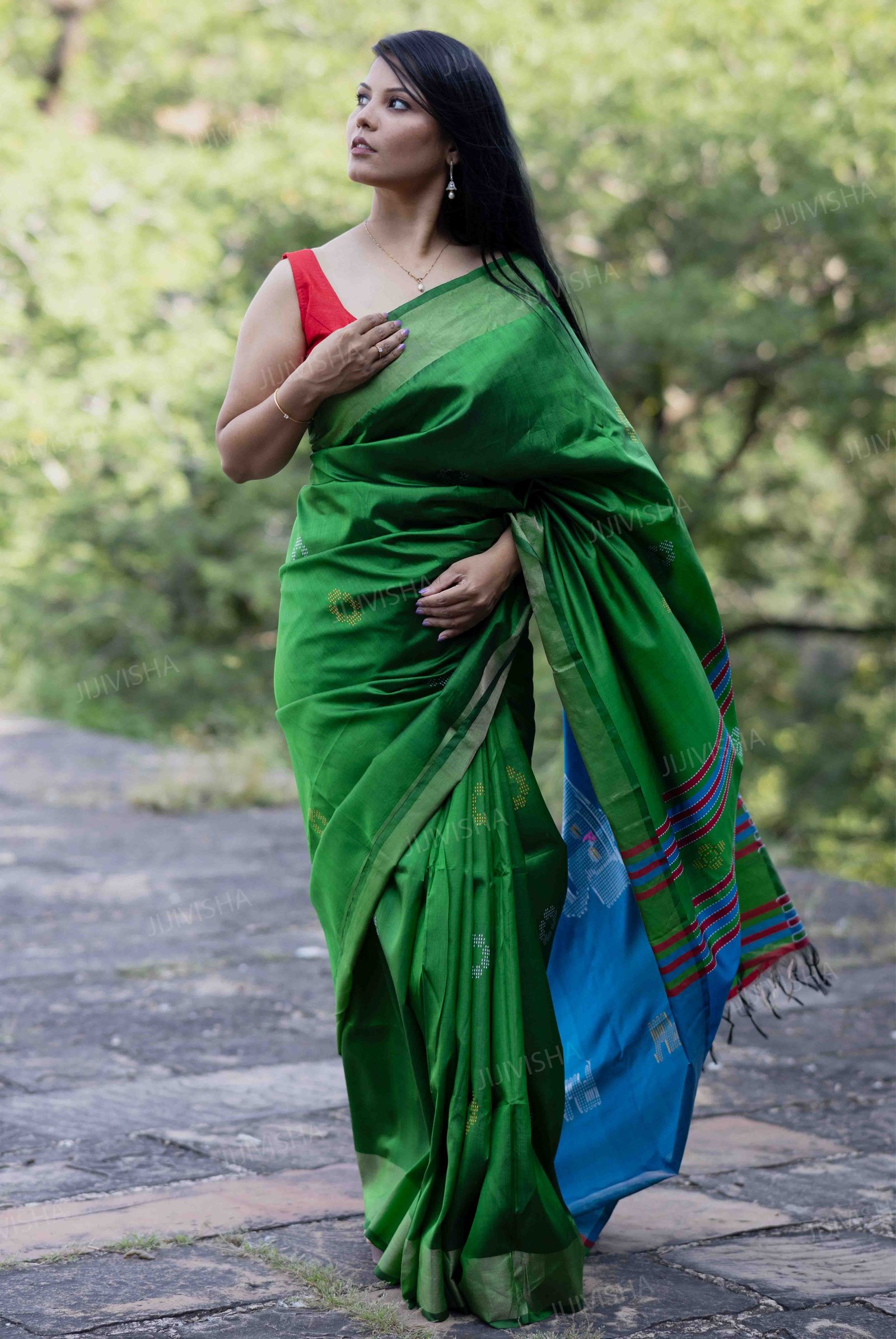 Regal Verdure: Leaf Green and Royal Blue Bishnupuri Pure Silk Kalakhetra Handspun Handwoven Saree