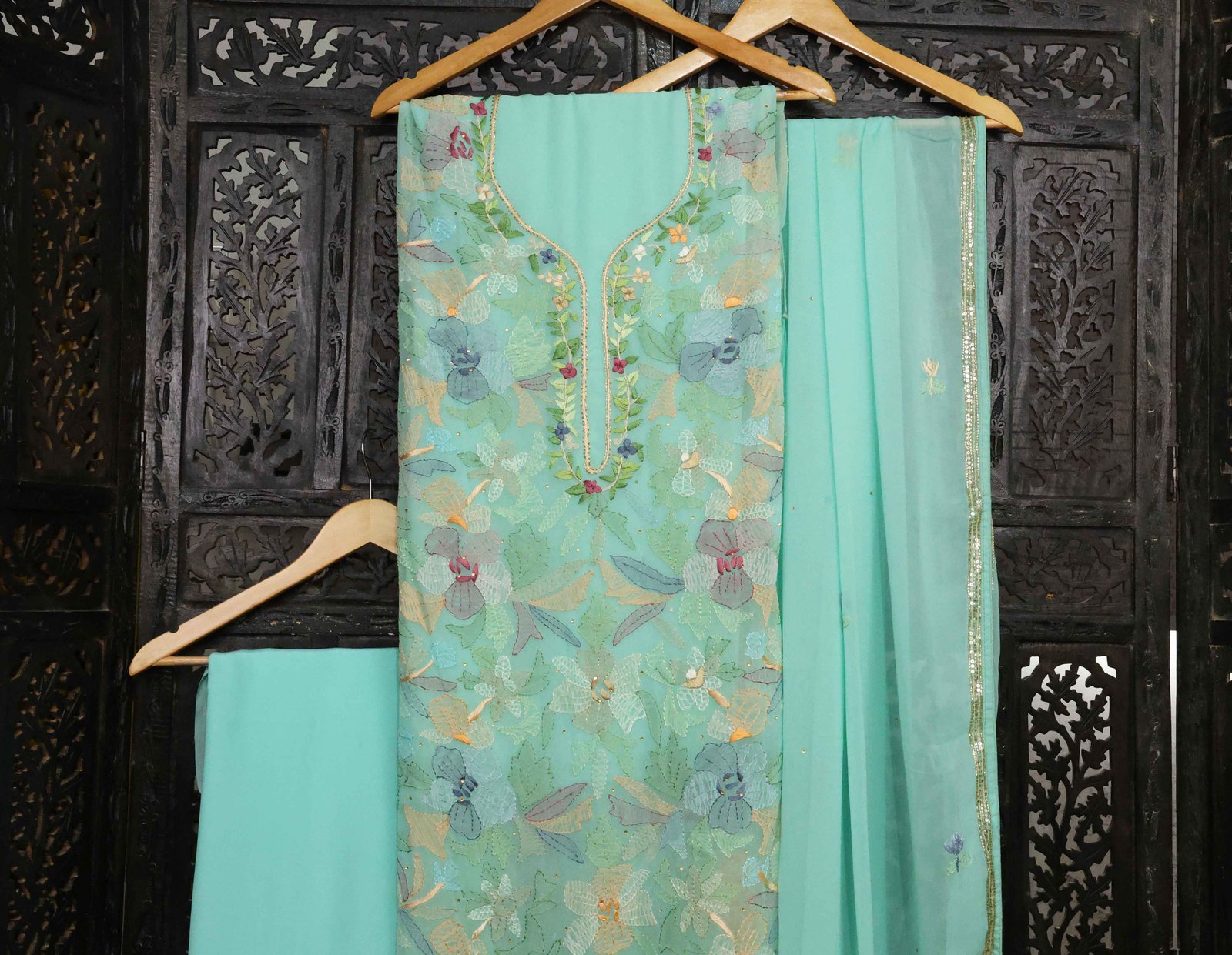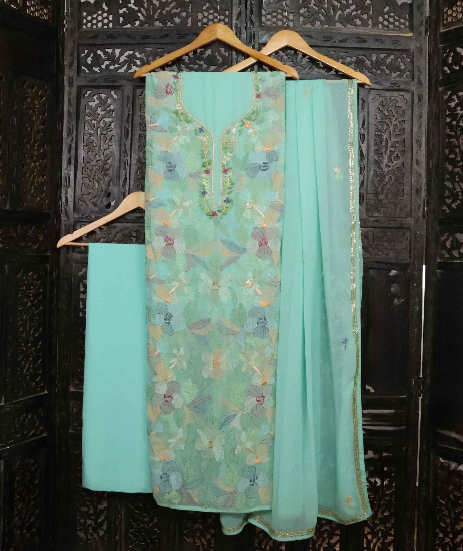 The Jijivisha Collection features a graceful Kurta Set in luxurious Georgette fabric, offered in a serene sea green color. This set of 3 includes a beautifully designed kurta, matching pants, and an elegant dupatta. The kurta and dupatta are adorned with intricate floral multi-colored hand Chikankari embroidery, showcasing delicate craftsmanship and a stunning blend of vibrant hues. The embroidery is enhanced with sparkling sequins and cut dana handwork, adding a subtle shimmer and elegance to the piece. The dupatta border also carries the same exquisite detailing, tying the entire ensemble together. Perfect for festive occasions, this set exudes timeless beauty, combining the delicate artistry of Chikankari with the flowing elegance of Georgette fabric for a refined, sophisticated look.