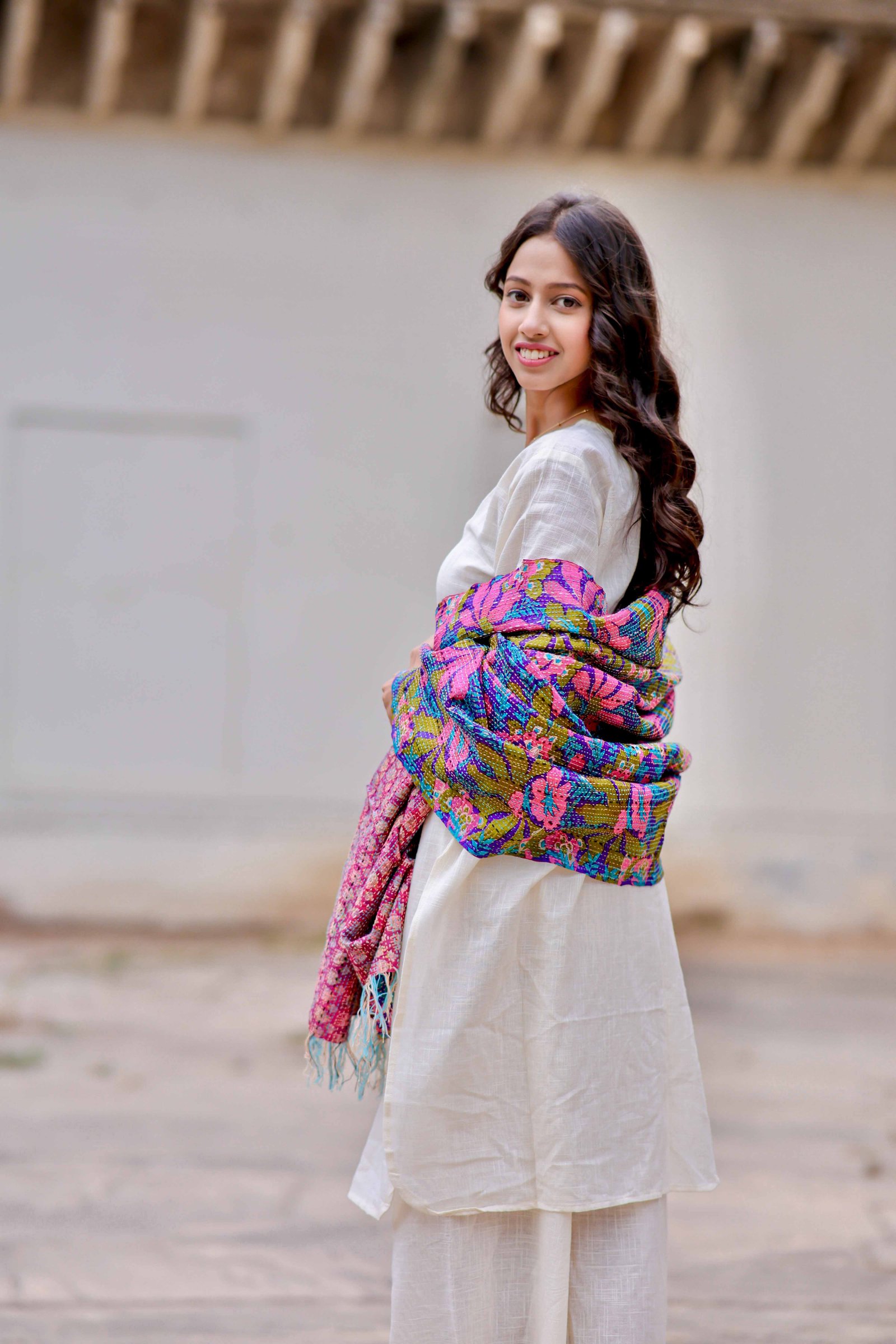 The Jijivisha collection presents a stunning blue and pink floral Kantha stitch handwoven stole, blending tradition with elegance. This beautiful accessory is crafted with intricate Kantha embroidery, an age-old technique from Bengal that adds charm and character to every thread. The floral motifs in soothing blue and pink hues create a harmonious design, perfect for both casual and festive occasions. Made from high-quality, soft, handwoven fabric, the stole drapes effortlessly, offering comfort and style in equal measure. Whether you’re elevating a simple outfit or adding a cultural touch to your ensemble, this stole is a timeless addition to your wardrobe. Embrace the art of slow fashion with this exquisite piece from the Jijivisha collection.