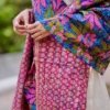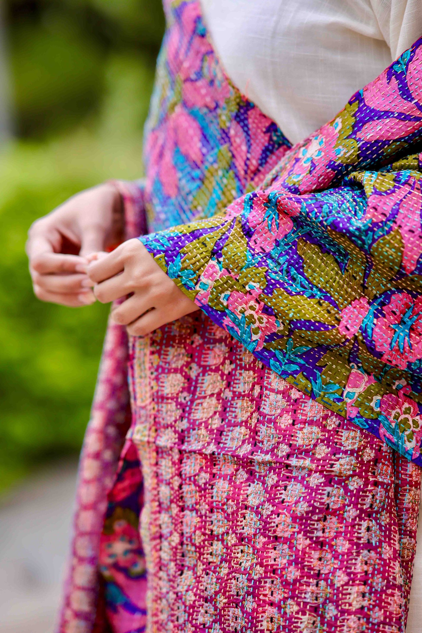 Stunning Blue And Pink Floral Kantha Stitch Silk Stole
