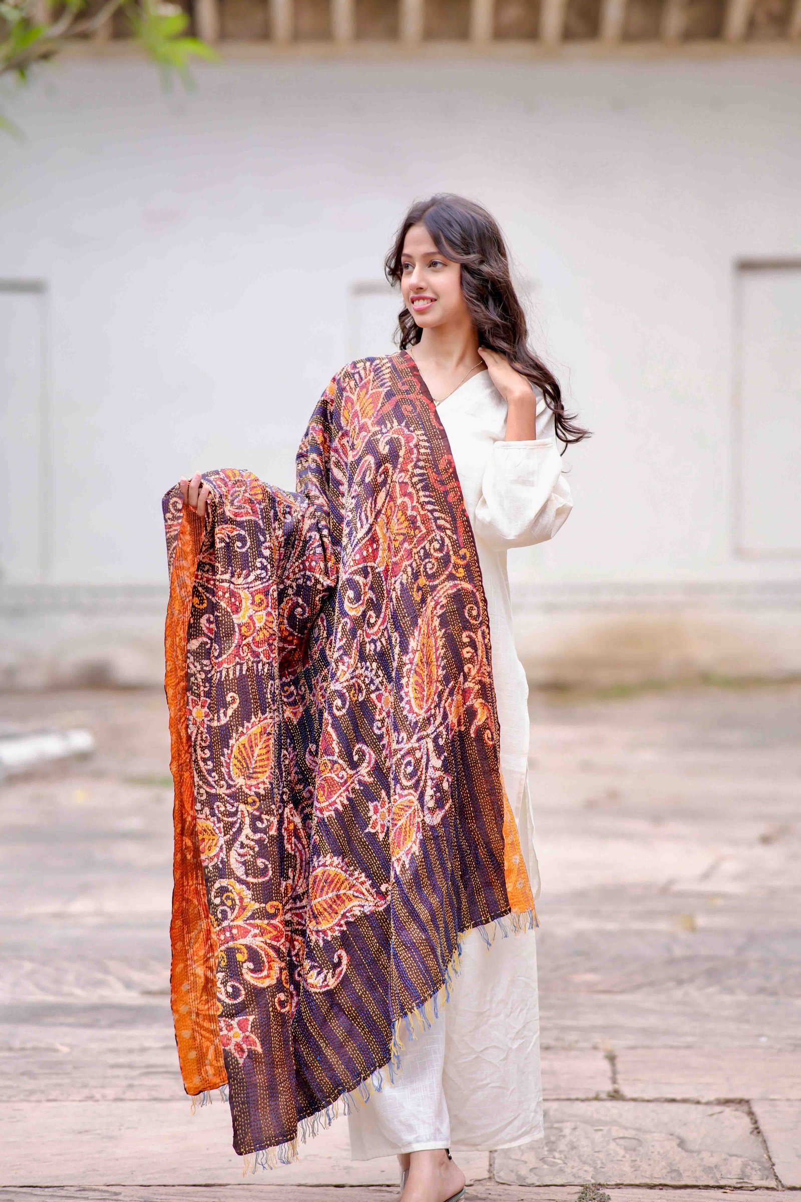 The Jijivisha collection features a stunning reversible silk stole in rich shades of orange and brown, designed to offer both elegance and versatility. Crafted from luxurious silk, this stole showcases a beautiful leaf print that adds a touch of nature-inspired charm. One side highlights warm orange tones, while the reverse complements with earthy brown, allowing you to switch up your look effortlessly. The soft, smooth texture of silk ensures a graceful drape and a comfortable feel, making it perfect for both casual and formal wear. Whether paired with traditional or contemporary outfits, this stole is a timeless accessory. Celebrate refined craftsmanship and thoughtful design with this elegant reversible piece from the Jijivisha collection.Colour- Orange And BrownFabric-SilkArt-Handwoven fabric stoles are crafted on traditional looms, reflecting the skill and artistry of local weavers. Each stole carries unique patterns, textures, and slight imperfections that add character and authenticity. Made with natural fibers and age-old techniques, they promote sustainability and cultural heritage. Handwoven stoles are not just fashion accessories—they are timeless pieces of wearable art that celebrate craftsmanship, tradition, and the beauty of slow, mindful creation.