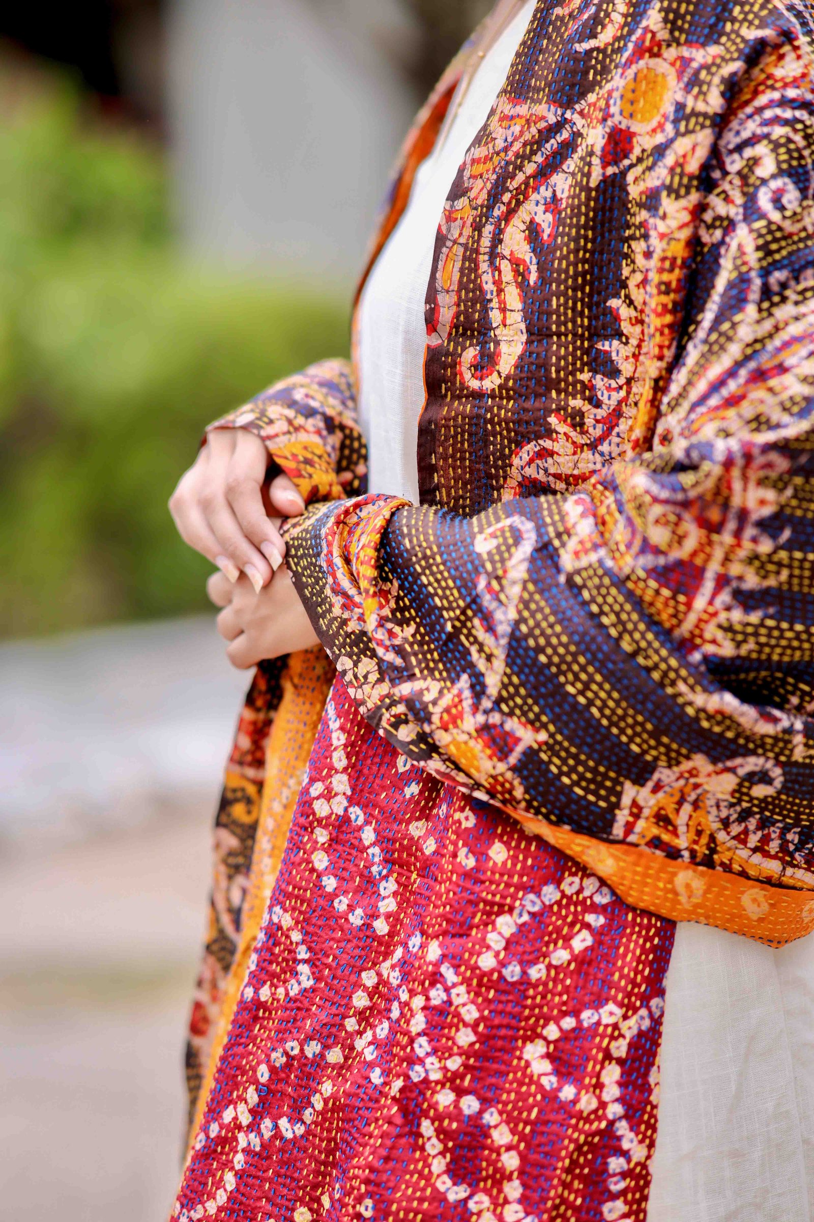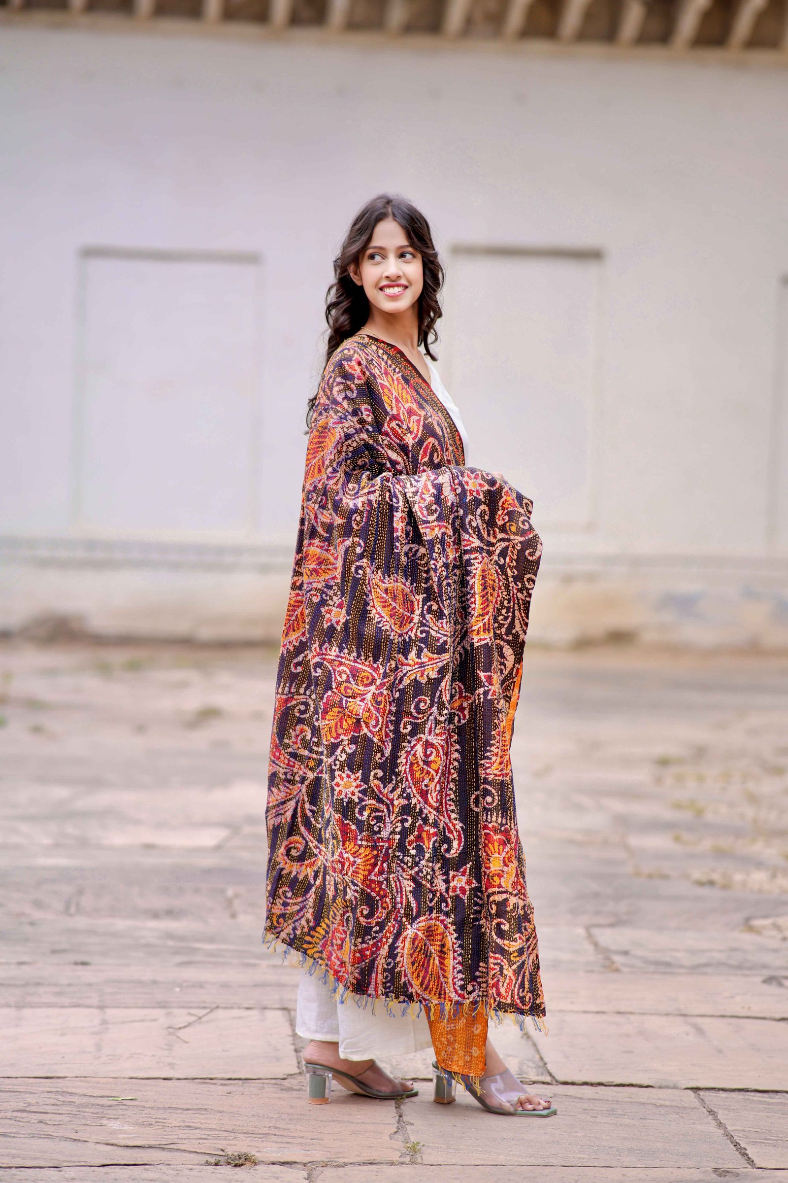 The Jijivisha collection features a stunning reversible silk stole in rich shades of orange and brown, designed to offer both elegance and versatility. Crafted from luxurious silk, this stole showcases a beautiful leaf print that adds a touch of nature-inspired charm. One side highlights warm orange tones, while the reverse complements with earthy brown, allowing you to switch up your look effortlessly. The soft, smooth texture of silk ensures a graceful drape and a comfortable feel, making it perfect for both casual and formal wear. Whether paired with traditional or contemporary outfits, this stole is a timeless accessory. Celebrate refined craftsmanship and thoughtful design with this elegant reversible piece from the Jijivisha collection.