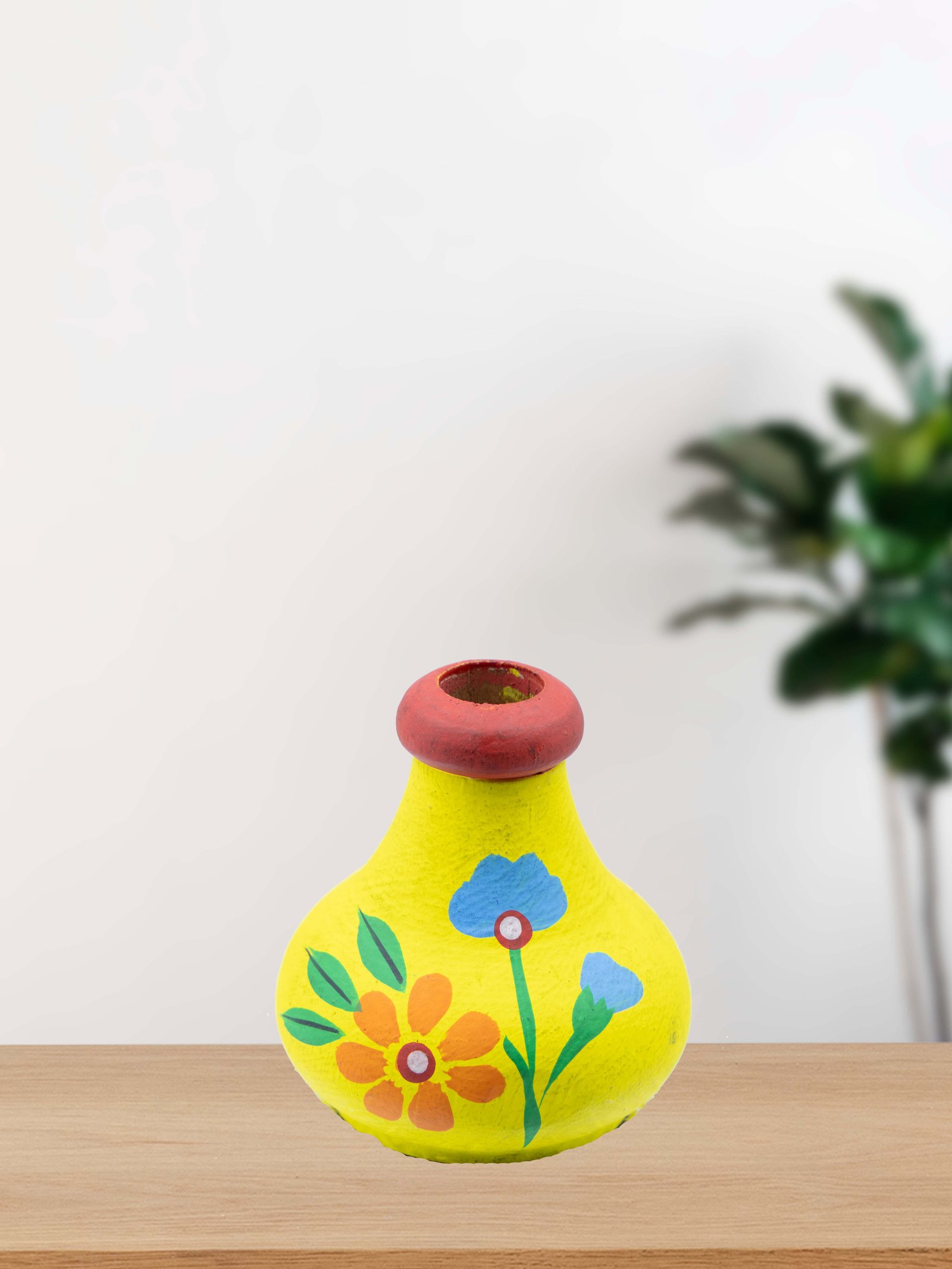 Sunny Blossom: Hand-Painted Yellow Wooden Pot with Floral Patterns