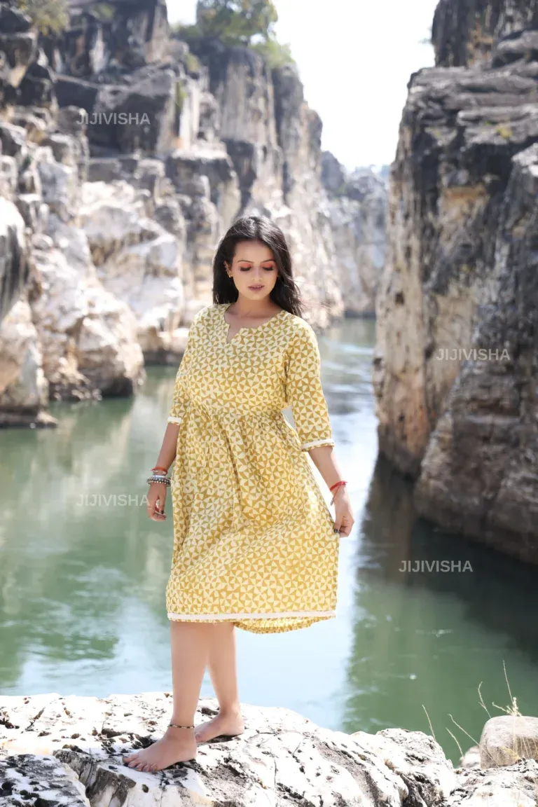 - Radiate warmth and style with our Sunshine Triangle Motif Hand Block Print Cotton Frock. Crafted from high-quality cotton, this frock features a vibrant yellow hue adorned with playful triangle motifs, hand block printed by skilled artisans.
