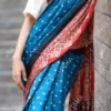 - Whether worn at festive celebrations, cultural events, or formal gatherings, the “Teal Tranquility” saree exudes an air of sophistication and cultural richness. Embrace the heritage of Indian craftsmanship with this exquisite saree that brings together the best of traditional artistry and modern style.