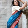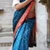 - The border of the saree is adorned with the classic beauty of Ajrakh print, featuring intricate motifs and geometric patterns inspired by nature and traditional Indian art. The harmonious fusion of teal and Ajrakh print on the border enhances the saree’s overall appeal, creating a piece that is both timeless and contemporary.