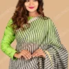 - Elevate your traditional ensemble with this elegant Chanderi silk saree, featuring a timeless black and white stripes. This saree is a tribute to classic style, exuding sophistication and grace. What sets it apart is the included pre-stitched full sleeves blouse, in flouroscent green colour, completing the ensemble with a traditional yet trendy touch.