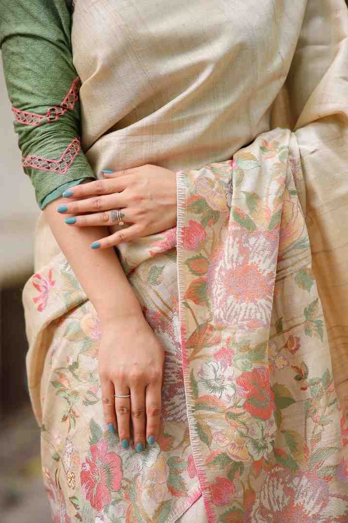 - The Tussar Silk Saree with Hand Embroidery with blouse piece is a traditional Indian garment made from lightweight, breathable fabric. The saree features a Tussar Silk Saree with Hand Embroidery. It comes with a matching blouse piece that can be tailored to fit. This saree is versatile and suitable for both casual and formal occasions, and is comfortable to wear in warmer weather.