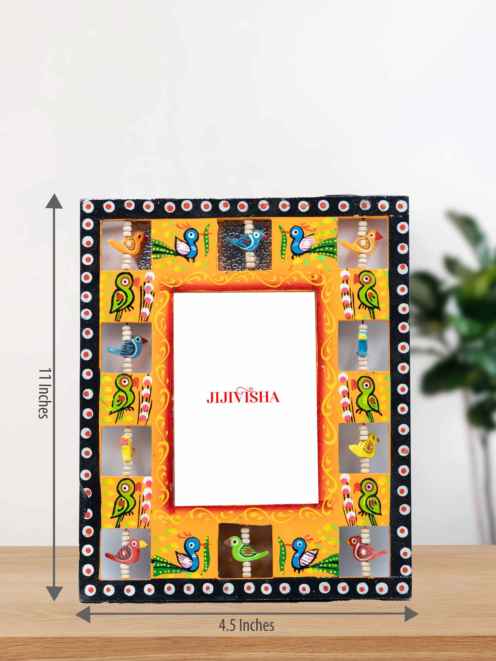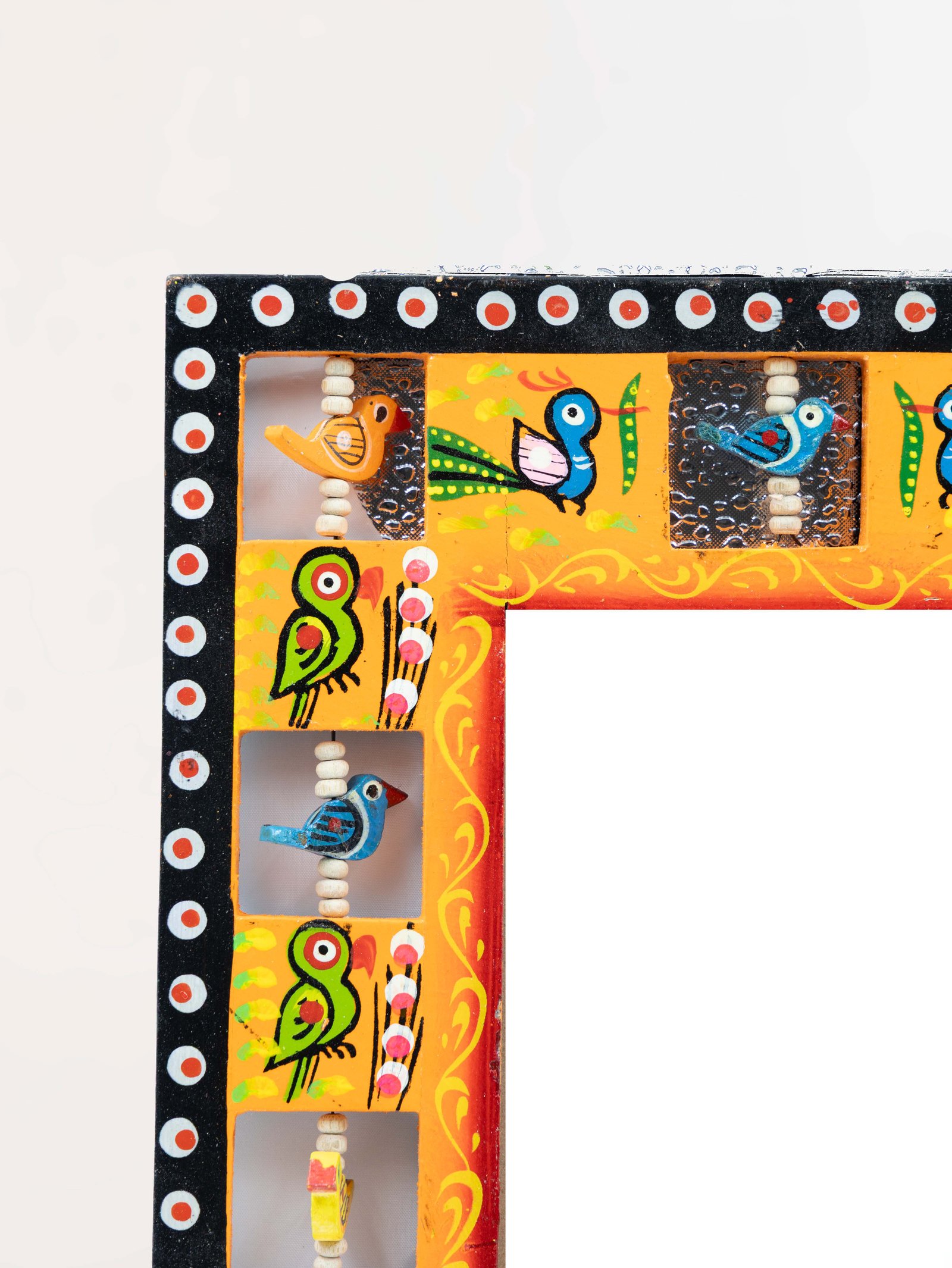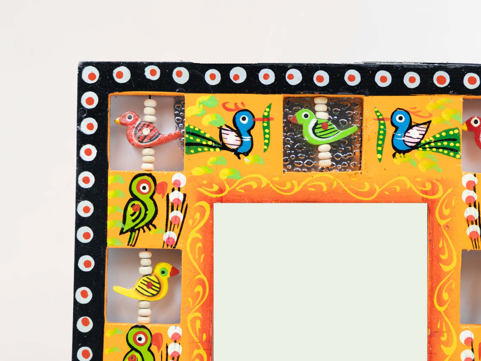 Fusion of Tradition and Art: This hand-painted orange wooden picture frame will add an infusion of color and artistic flair to your house. This frame, with its complex folk-art pattern, combines classic craftsmanship with contemporary style. The vibrant orange background, decorated with intricate patterns and vibrant bird designs, creates a visually striking accent piece that elevates any area. This handcrafted item is sure to make a statement whether it is used as a wooden mirror frame or to display treasured memories.