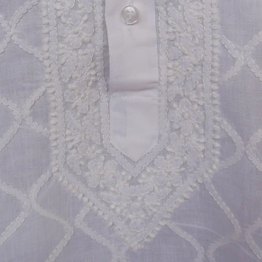 - Kurta is fabricated in cotton, comfortable to wear with Denims, Pyjamas etc Featuring chikanakari embroidery, this is a 100% hand embroidered product.